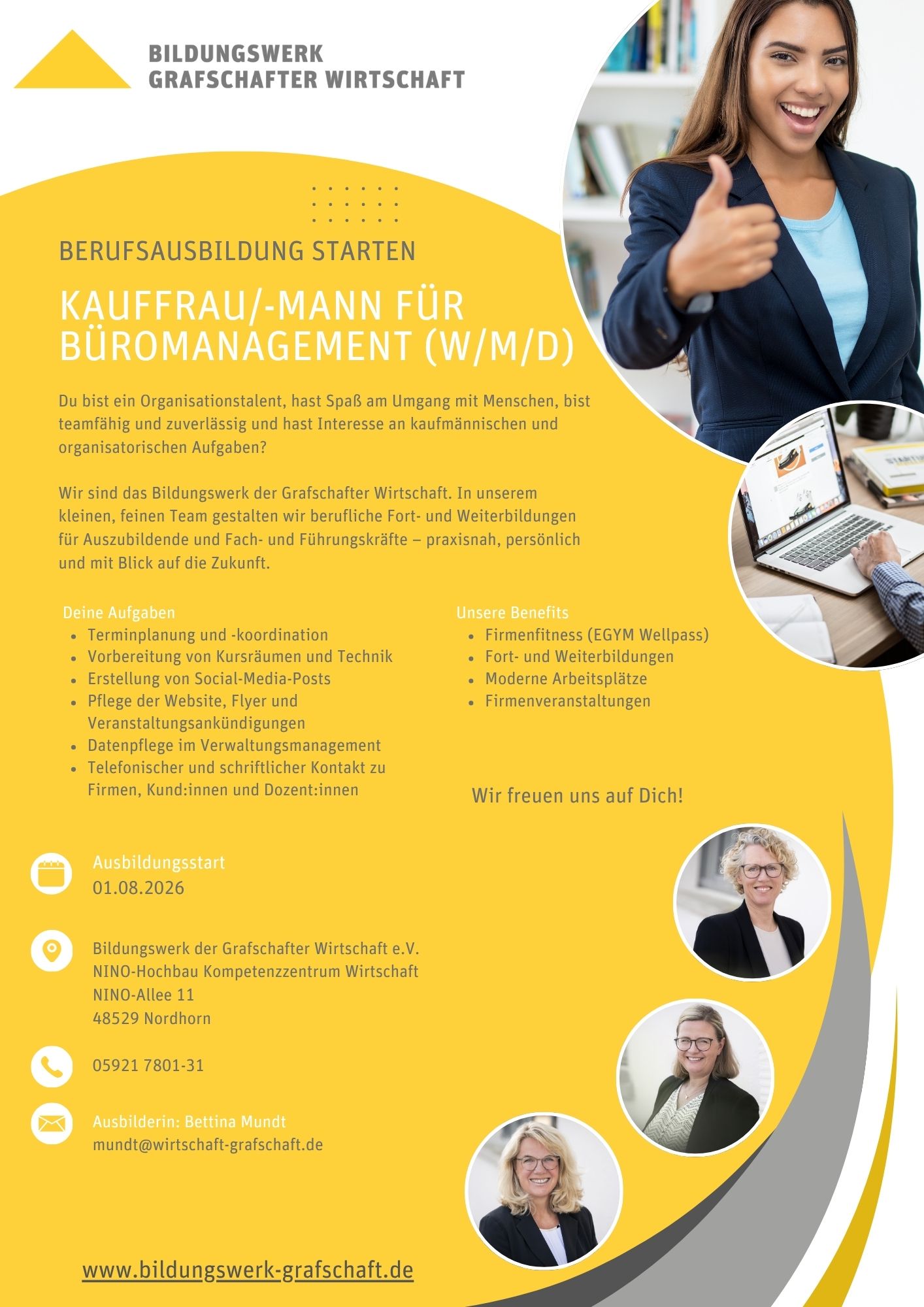 Neuigkeit Berufsausbildung starten! Okt. 2025 Bitte sende deine Bewerbungsunterlagen an Bettina Mundt unter mundt@wirtschaft-grafschaft.de. Teilnahmebedingungen